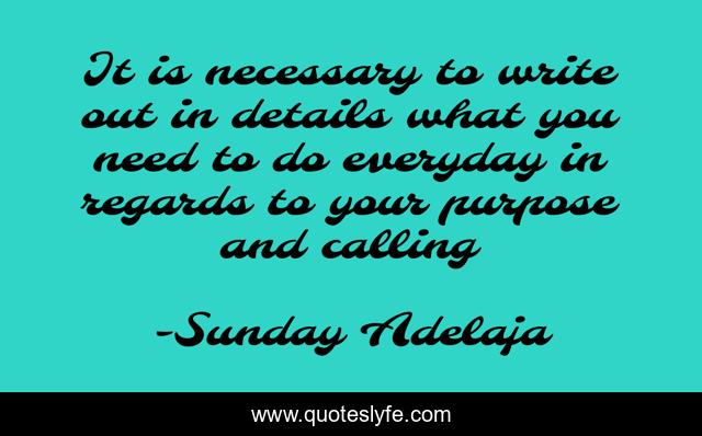 This page presents the quote "It is necessary to write out in details what you need to do everyday in regards to your purpose and calling". Author of this quote is Sunday Adelaja. This quote is about life, necessary, goal, mission, calling, purpose, necessity, concern,.