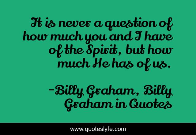 This page presents the quote "It is never a question of how much you and I have of the Spirit, but how much He has of us.". Author of this quote is Billy Graham, Billy Graham in Quotes. This quote is about billy-graham, holy-spirit,.