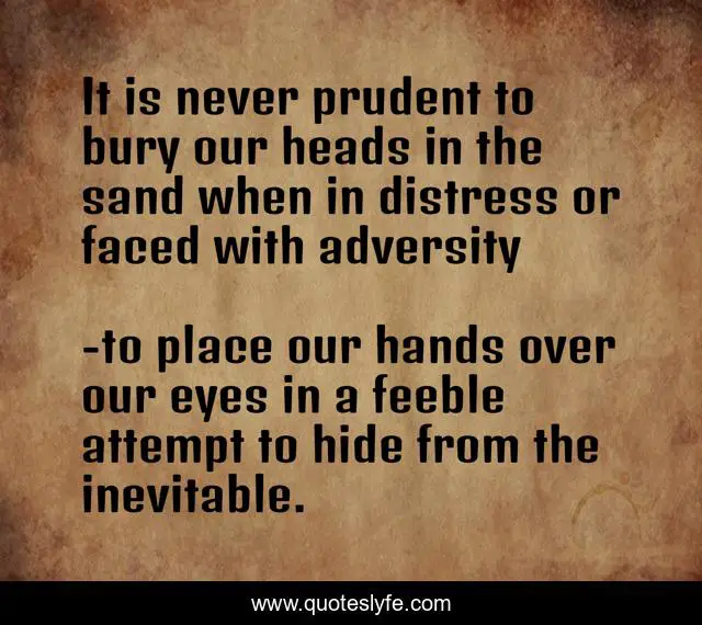 This page presents the quote "It is never prudent to bury our heads in the sand when in distress or faced with adversity". Author of this quote is to place our hands over our eyes in a feeble attempt to hide from the inevitable.. This quote is about the other 99 t.y.m.e.s: train your mind to enjoy serenity, carlos wallace,.