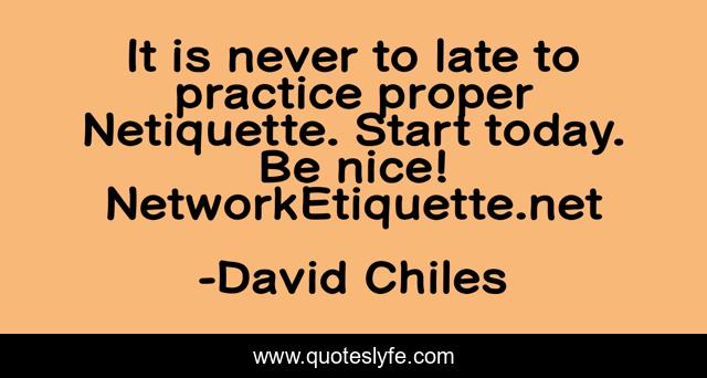 This page presents the quote "It is never to late to practice proper Netiquette. Start today. Be nice! NetworkEtiquette.net". Author of this quote is David Chiles. This quote is about etiquette, network, rules-for-netiquette, media, internet, netiquette-rules, manners, netiquette, rules-of-netiquette,.