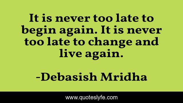 This page presents the quote "It is never too late to begin again. It is never too late to change and live again.". Author of this quote is Debasish Mridha. This quote is about life, love, knowledge, inspirational, intelligence, philosophy, wisdom, quotes, affection,.