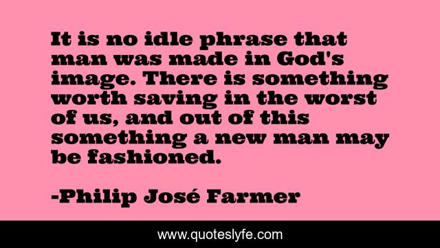 This page presents the quote "It is no idle phrase that man was made in God's image. There is something worth saving in the worst of us, and out of this something a new man may be fashioned.". Author of this quote is Philip José Farmer. This quote is about image-of-god, man,.