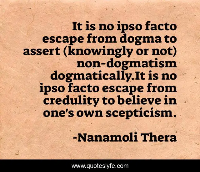 This page presents the quote "It is no ipso facto escape from dogma to assert (knowingly or not) non-dogmatism dogmatically.It is no ipso facto escape from credulity to believe in one's own scepticism.". Author of this quote is Nanamoli Thera. .