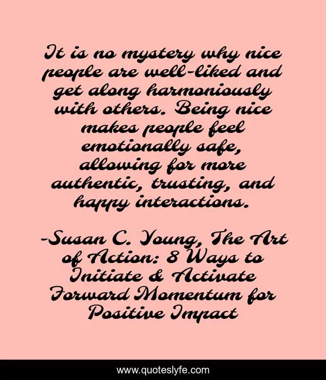 This page presents the quote "It is no mystery why nice people are well-liked and get along harmoniously with others. Being nice makes people feel emotionally safe, allowing for more authentic, trusting, and happy interactions.". Author of this quote is Susan C. Young, The Art of Action: 8 Ways to Initiate & Activate Forward Momentum for Positive Impact. This quote is about build-momentum, customer-service, communication-skills, just-be-nice, emotional-intelligence, positive-first-impression, quotes-by-susan-c-young, relationship, motivational-speaker-susan-young,.