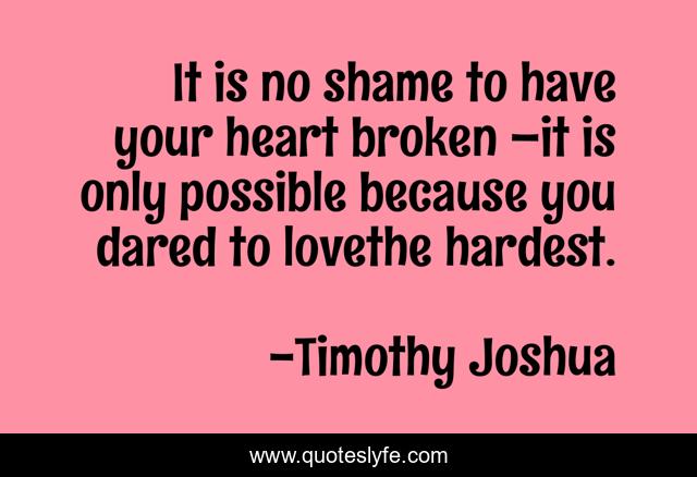 This page presents the quote "It is no shame to have your heart broken –it is only possible because you dared to lovethe hardest.". Author of this quote is Timothy Joshua. This quote is about heartbroken, quote, love, romance-love, affection,.