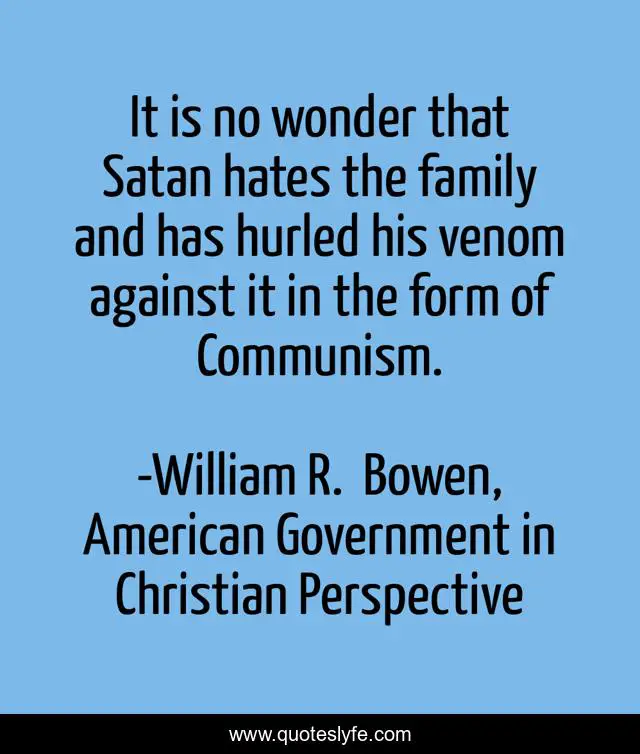 This page presents the quote "It is no wonder that Satan hates the family and has hurled his venom against it in the form of Communism.". Author of this quote is William R. Bowen, American Government in Christian Perspective. This quote is about homeschooling, communism, satan, family, america,.