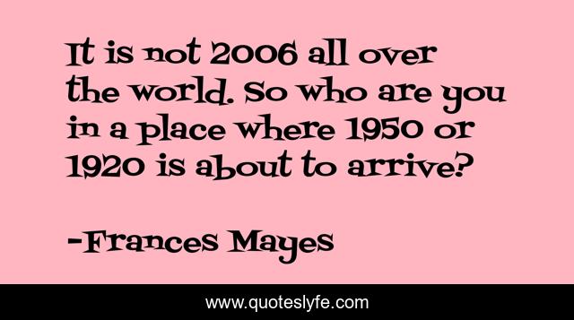 "Frances Mayes Quotes." Quoteslyfe.com, 2025. Fri. 05 Dec. 2025. <https://www.quoteslyfe.com/quote/It-is-not-2006-all-over-the-137262>.