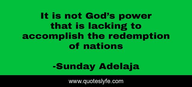 This page presents the quote "It is not God’s power that is lacking to accomplish the redemption of nations". Author of this quote is Sunday Adelaja. This quote is about accomplish, lacking, power,.