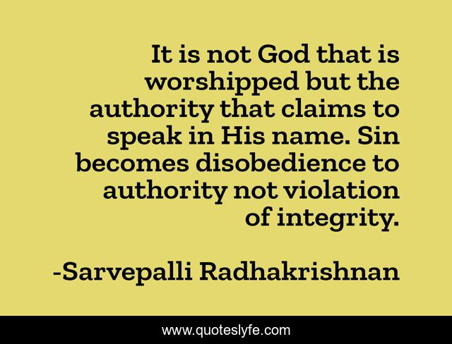 This page presents the quote "It is not God that is worshipped but the authority that claims to speak in His name. Sin becomes disobedience to authority not violation of integrity.". Author of this quote is Sarvepalli Radhakrishnan. .