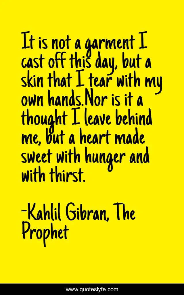 This page presents the quote "It is not a garment I cast off this day, but a skin that I tear with my own hands.Nor is it a thought I leave behind me, but a heart made sweet with hunger and with thirst.". Author of this quote is Kahlil Gibran, The Prophet. This quote is about travel, love, moving-on, affection,.