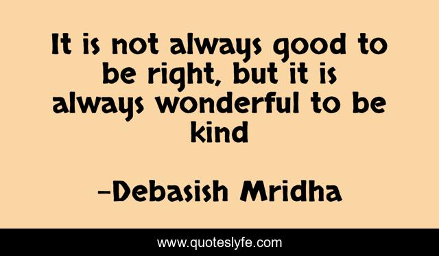 This page presents the quote "It is not always good to be right, but it is always wonderful to be kind". Author of this quote is Debasish Mridha. This quote is about it-is-good-to-be-kind, be-right, philosophy, debasish-mridha, be-kind, quotes, debasish-mridha-md, inspirational, enthusiasm,.