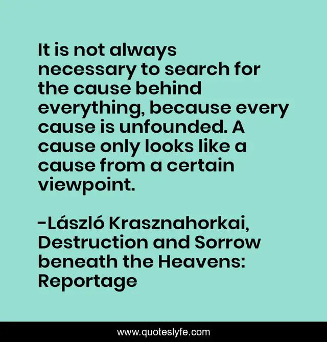 This page presents the quote "It is not always necessary to search for the cause behind everything, because every cause is unfounded. A cause only looks like a cause from a certain viewpoint.". Author of this quote is László Krasznahorkai, Destruction and Sorrow beneath the Heavens: Reportage. This quote is about certainty, meaning, perspective, point-of-view, explanations, causes,.