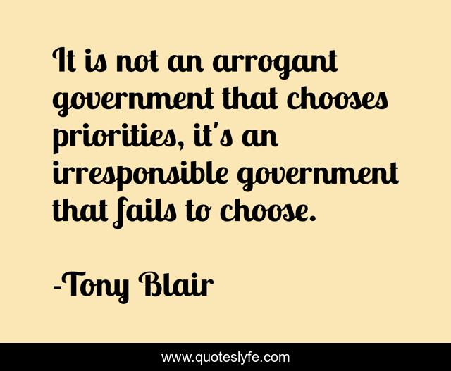 This page presents the quote "It is not an arrogant government that chooses priorities, it's an irresponsible government that fails to choose.". Author of this quote is Tony Blair. This quote is about priorities, choose, arrogant,.