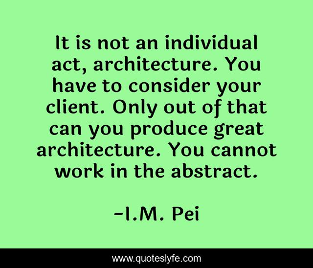 This page presents the quote "It is not an individual act, architecture. You have to consider your client. Only out of that can you produce great architecture. You cannot work in the abstract.". Author of this quote is I.M. Pei. This quote is about city, urban, abstract, urban-planning, client, architecture,.