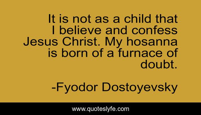 This page presents the quote "It is not as a child that I believe and confess Jesus Christ. My hosanna is born of a furnace of doubt.". Author of this quote is Fyodor Dostoyevsky. This quote is about faith, doubt, christ,.