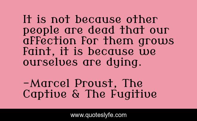 This page presents the quote "It is not because other people are dead that our affection for them grows faint, it is because we ourselves are dying.". Author of this quote is Marcel Proust, The Captive & The Fugitive. .