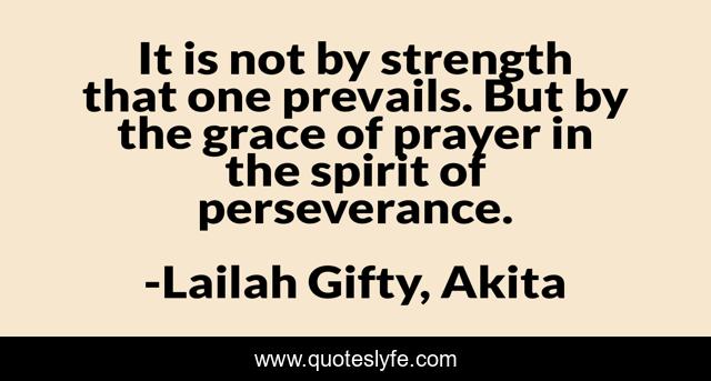 This page presents the quote "It is not by strength that one prevails. But by the grace of prayer in the spirit of perseverance.". Author of this quote is Lailah Gifty, Akita. This quote is about perseverance, confidence, christian, positive, motivational, grace, difficult-times, dont-give-up, optimistic,.