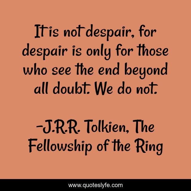 This page presents the quote "It is not despair, for despair is only for those who see the end beyond all doubt. We do not.". Author of this quote is J.R.R. Tolkien, The Fellowship of the Ring. This quote is about gandalf, despair, hope,.
