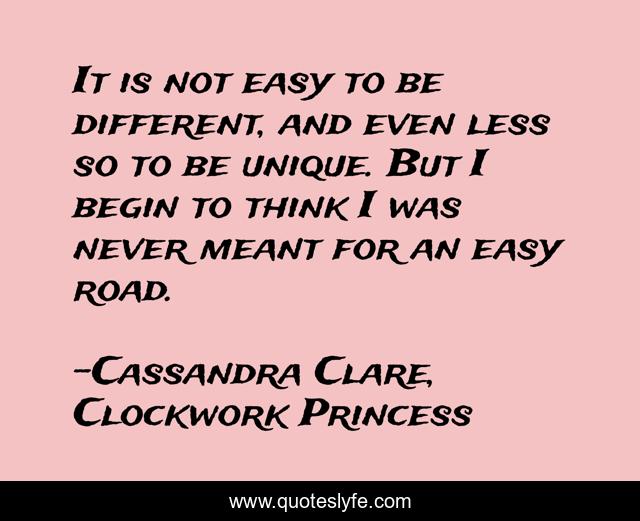 This page presents the quote "It is not easy to be different, and even less so to be unique. But I begin to think I was never meant for an easy road.". Author of this quote is Cassandra Clare, Clockwork Princess. This quote is about different, unique, life, tessa-gray, clockwork-princess,.