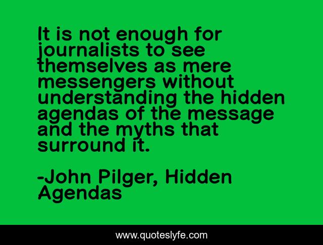 This page presents the quote "It is not enough for journalists to see themselves as mere messengers without understanding the hidden agendas of the message and the myths that surround it.". Author of this quote is John Pilger, Hidden Agendas. This quote is about media, journalism, politics,.