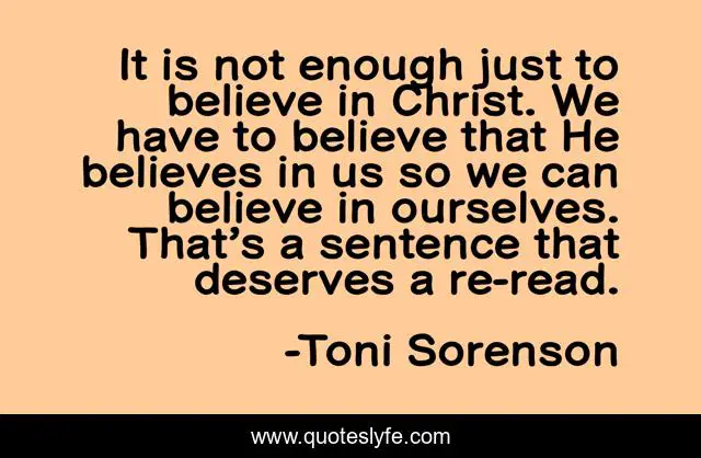 This page presents the quote "It is not enough just to believe in Christ. We have to believe that He believes in us so we can believe in ourselves. That’s a sentence that deserves a re-read.". Author of this quote is Toni Sorenson. This quote is about faith, self, belief, christ, jesus,.