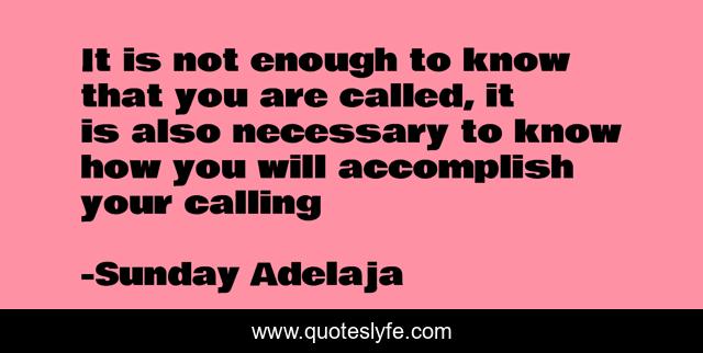 This page presents the quote "It is not enough to know that you are called, it is also necessary to know how you will accomplish your calling". Author of this quote is Sunday Adelaja. This quote is about accomplish, necessary, calling, call, fulfillment, purpose,.
