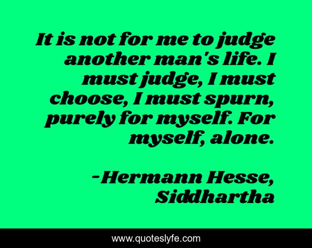 This page presents the quote "It is not for me to judge another man's life. I must judge, I must choose, I must spurn, purely for myself. For myself, alone.". Author of this quote is Hermann Hesse, Siddhartha. This quote is about self, focus, choices, judgement, humility, judgemental, tolerance,.