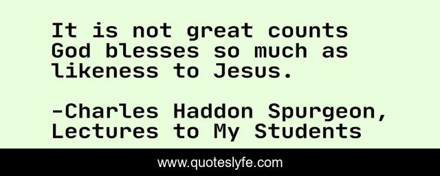 This page presents the quote "It is not great counts God blesses so much as likeness to Jesus.". Author of this quote is Charles Haddon Spurgeon, Lectures to My Students. This quote is about discipleship, humility, ministry,.