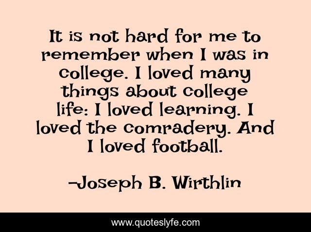 This page presents the quote "It is not hard for me to remember when I was in college. I loved many things about college life: I loved learning. I loved the comradery. And I loved football.". Author of this quote is Joseph B. Wirthlin. This quote is about life, football, college,.