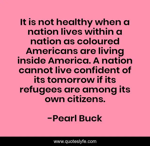 This page presents the quote "It is not healthy when a nation lives within a nation as coloured Americans are living inside America. A nation cannot live confident of its tomorrow if its refugees are among its own citizens.". Author of this quote is Pearl Buck. This quote is about bigotry, prejudice,.
