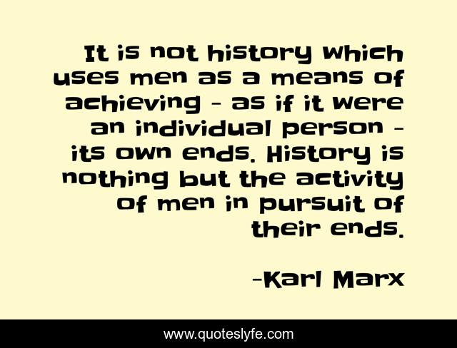 This page presents the quote "It is not history which uses men as a means of achieving - as if it were an individual person - its own ends. History is nothing but the activity of men in pursuit of their ends.". Author of this quote is Karl Marx. This quote is about person, men, achieving,.