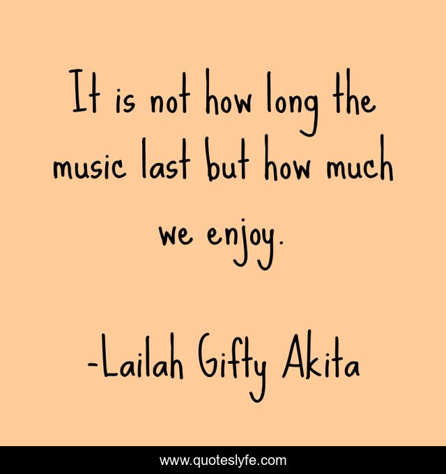 This page presents the quote "It is not how long the music last but how much we enjoy.". Author of this quote is Lailah Gifty Akita. This quote is about enjoy, life-lessons, music, inspirational, enthusiasm, happiness,.