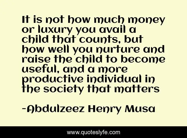 This page presents the quote "It is not how much money or luxury you avail a child that counts, but how well you nurture and raise the child to become useful, and a more productive individual in the society that matters". Author of this quote is Abdulzeez Henry Musa. .
