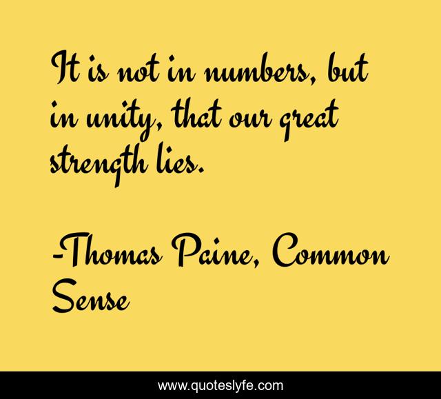 This page presents the quote "It is not in numbers, but in unity, that our great strength lies.". Author of this quote is Thomas Paine, Common Sense. This quote is about unity, strength,.