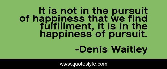 This page presents the quote "It is not in the pursuit of happiness that we find fulfillment, it is in the happiness of pursuit.". Author of this quote is Denis Waitley. This quote is about pursuit of happiness, find,.
