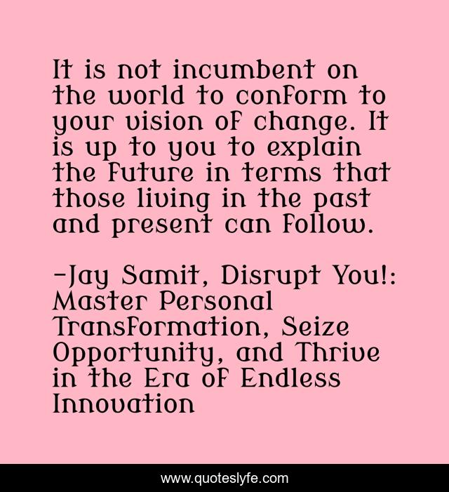 "Jay Samit, Disrupt You!: Master Personal Transformation, Seize Opportunity, and Thrive in the Era of Endless Innovation Quotes." Quoteslyfe.com, 2026. Mon. 12 Jan. 2026. <https://www.quoteslyfe.com/quote/It-is-not-incumbent-on-the-world-106519>.