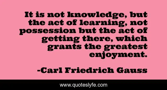 This page presents the quote "It is not knowledge, but the act of learning, not possession but the act of getting there, which grants the greatest enjoyment.". Author of this quote is Carl Friedrich Gauss. This quote is about greatest, knowledge, act,.