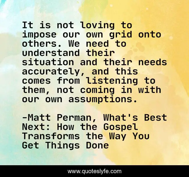 "Matt Perman, What's Best Next: How the Gospel Transforms the Way You Get Things Done Quotes." Quoteslyfe.com, 2025. Fri. 05 Dec. 2025. <https://www.quoteslyfe.com/quote/It-is-not-loving-to-impose-our-135218>.