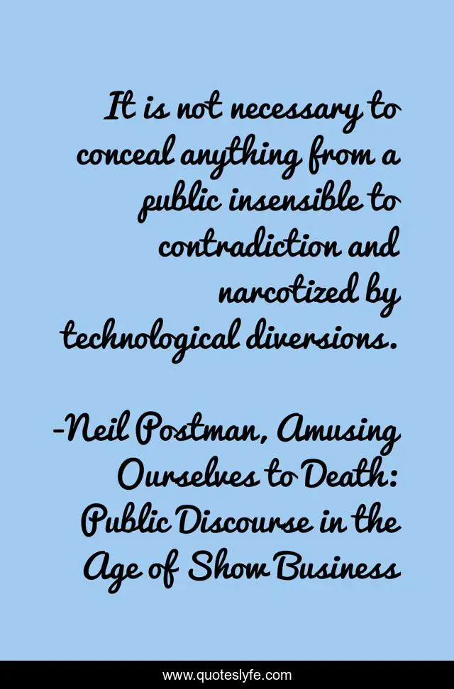 "Neil Postman, Amusing Ourselves to Death: Public Discourse in the Age of Show Business Quotes." Quoteslyfe.com, 2025. Fri. 05 Dec. 2025. <https://www.quoteslyfe.com/quote/It-is-not-necessary-to-conceal-anything-162797>.