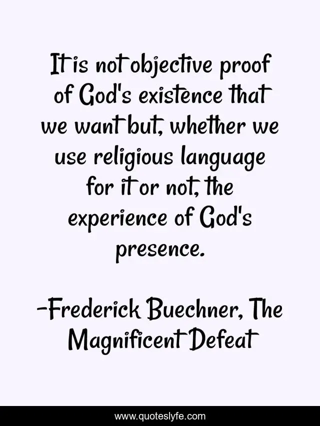 "Frederick Buechner, The Magnificent Defeat Quotes." Quoteslyfe.com, 2025. Fri. 05 Dec. 2025. <https://www.quoteslyfe.com/quote/It-is-not-objective-proof-of-God-11643>.