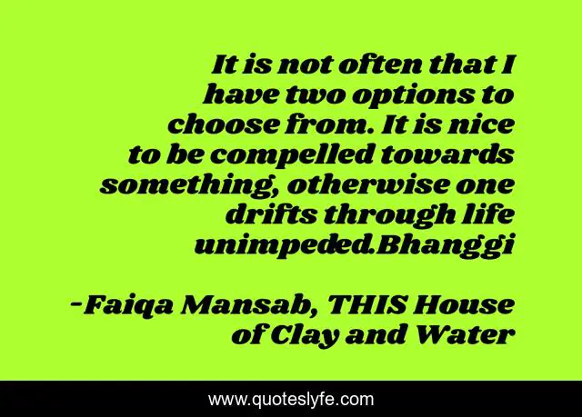 This page presents the quote "It is not often that I have two options to choose from. It is nice to be compelled towards something, otherwise one drifts through life unimpeded.Bhanggi". Author of this quote is Faiqa Mansab, THIS House of Clay and Water. This quote is about fiction-novel, lgbtq, fiction, literary-fiction, tragedy, contemporary-fiction,.