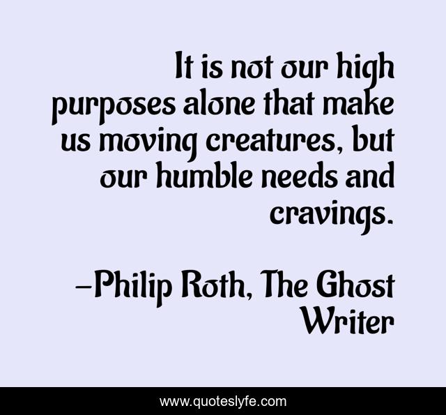 This page presents the quote "It is not our high purposes alone that make us moving creatures, but our humble needs and cravings.". Author of this quote is Philip Roth, The Ghost Writer. .