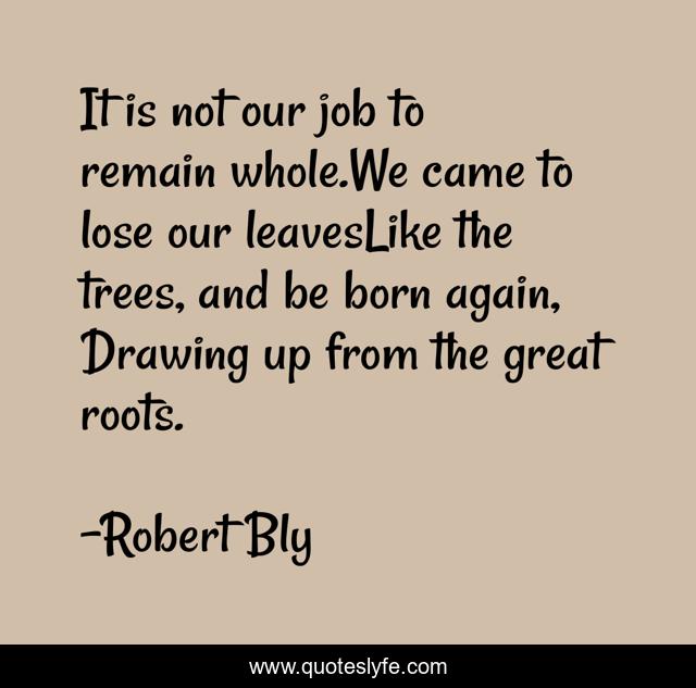 This page presents the quote "It is not our job to remain whole.We came to lose our leavesLike the trees, and be born again, Drawing up from the great roots.". Author of this quote is Robert Bly. .