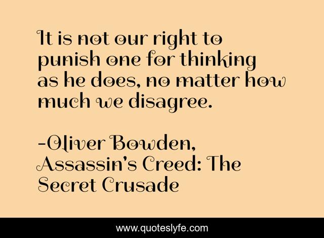 This page presents the quote "It is not our right to punish one for thinking as he does, no matter how much we disagree.". Author of this quote is Oliver Bowden, Assassin's Creed: The Secret Crusade. This quote is about right, knowledge, altaïr, thinking, no-matter, believe, people, mind, wisdom,.