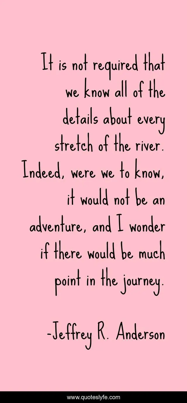 This page presents the quote "It is not required that we know all of the details about every stretch of the river. Indeed, were we to know, it would not be an adventure, and I wonder if there would be much point in the journey.". Author of this quote is Jeffrey R. Anderson. This quote is about river, navigation, adventure, grace, life-journey,.