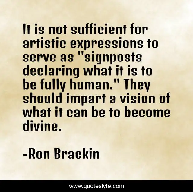 This page presents the quote "It is not sufficient for artistic expressions to serve as "signposts declaring what it is to be fully human." They should impart a vision of what it can be to become divine.". Author of this quote is Ron Brackin. This quote is about art, divinity, humanity, redemption,.