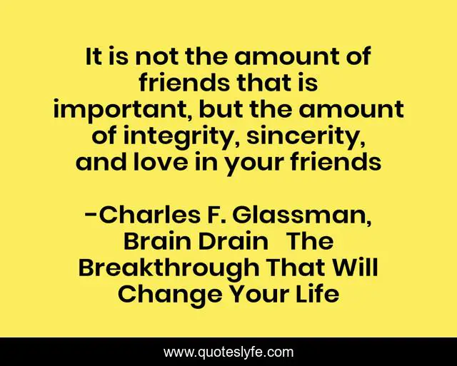 This page presents the quote "It is not the amount of friends that is important, but the amount of integrity, sincerity, and love in your friends". Author of this quote is Charles F. Glassman, Brain Drain The Breakthrough That Will Change Your Life. .
