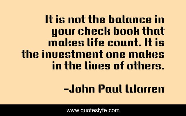 This page presents the quote "It is not the balance in your check book that makes life count. It is the investment one makes in the lives of others.". Author of this quote is John Paul Warren. This quote is about faith, love, church, gospel, grace, affection,.