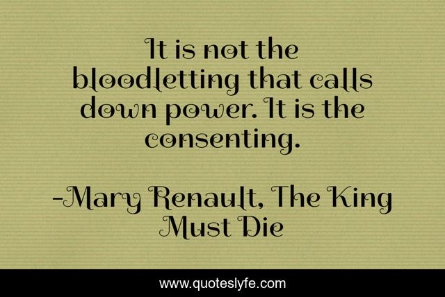 This page presents the quote "It is not the bloodletting that calls down power. It is the consenting.". Author of this quote is Mary Renault, The King Must Die. This quote is about pittheus, kings, ancient-greece, power, troizen,.
