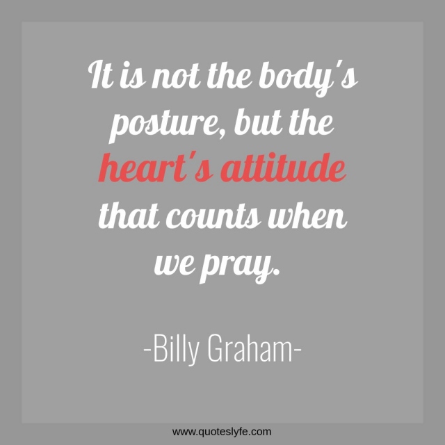 This page presents the quote "It is not the body's posture, but the heart's attitude that counts when we pray.". Author of this quote is Billy Graham. This quote is about body, heart, pray,.